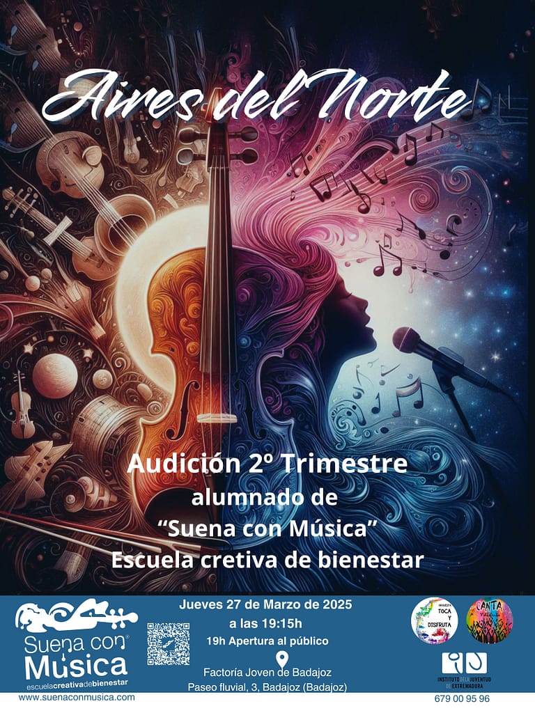 Este jueves el alumnado de «Suena con Música» – escuela creativa de bienestar compartirán músicas con aires del Norte. Instrumentos principales: Violín y voz. Colaboraciones, y el Coro «Canta y disfruta» junto a la Orquesta «Toca y Disfruta».